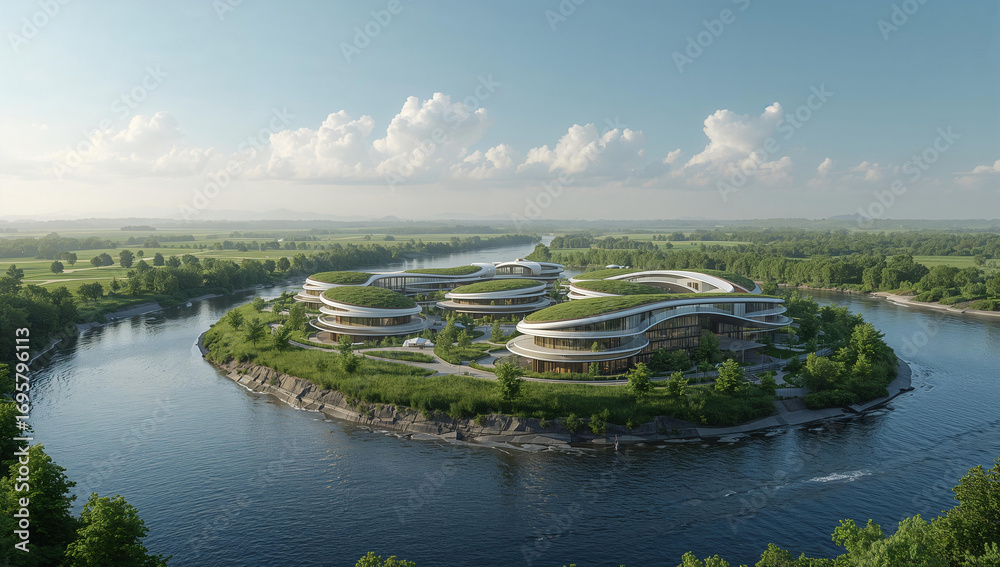 Plakat Wyspy - Futuristic Eco-Complex on a River Island #1695796113