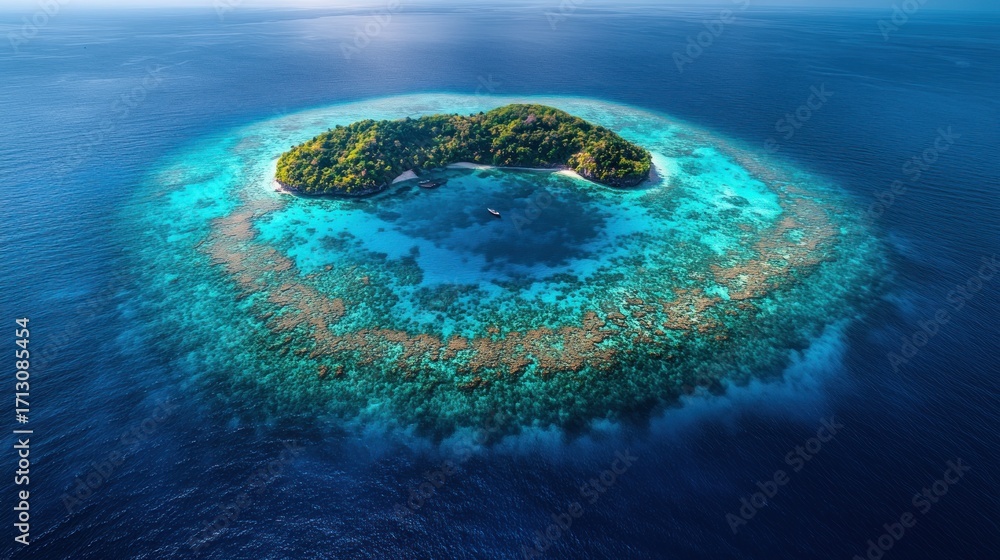 Plakat Wyspy - Aerial view of a stunning tropical island with a vibrant coral reef in clear turquoise ocean... #1713085454