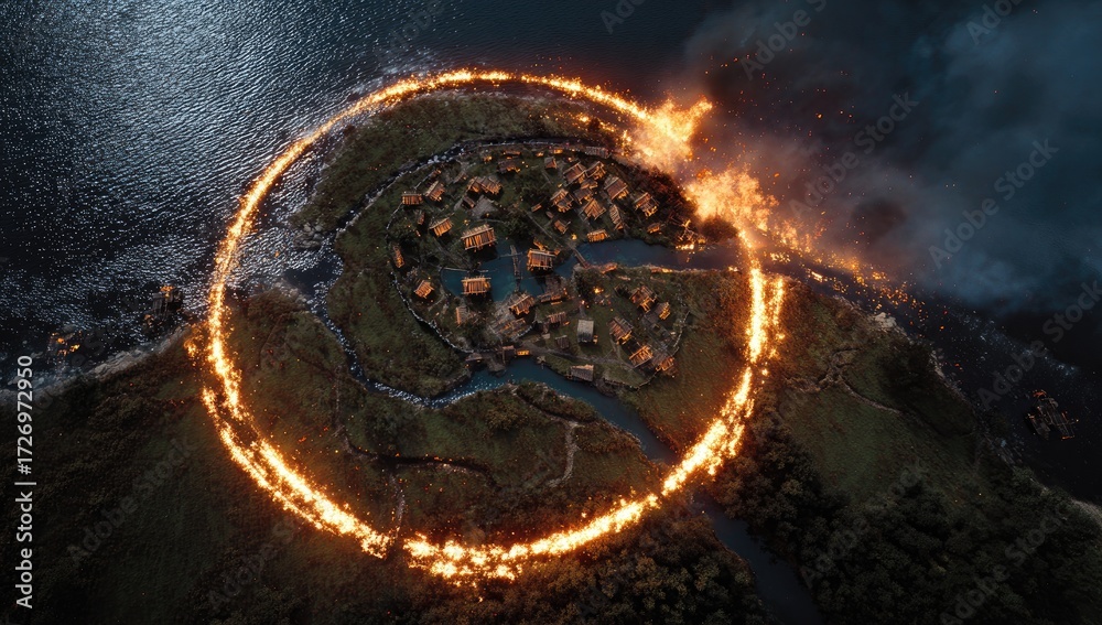Plakat Wyspy - Aerial view of a circular island village engulfed in fire #1726972950