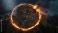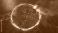 • Aerial view of a circular island village engulfed in fire