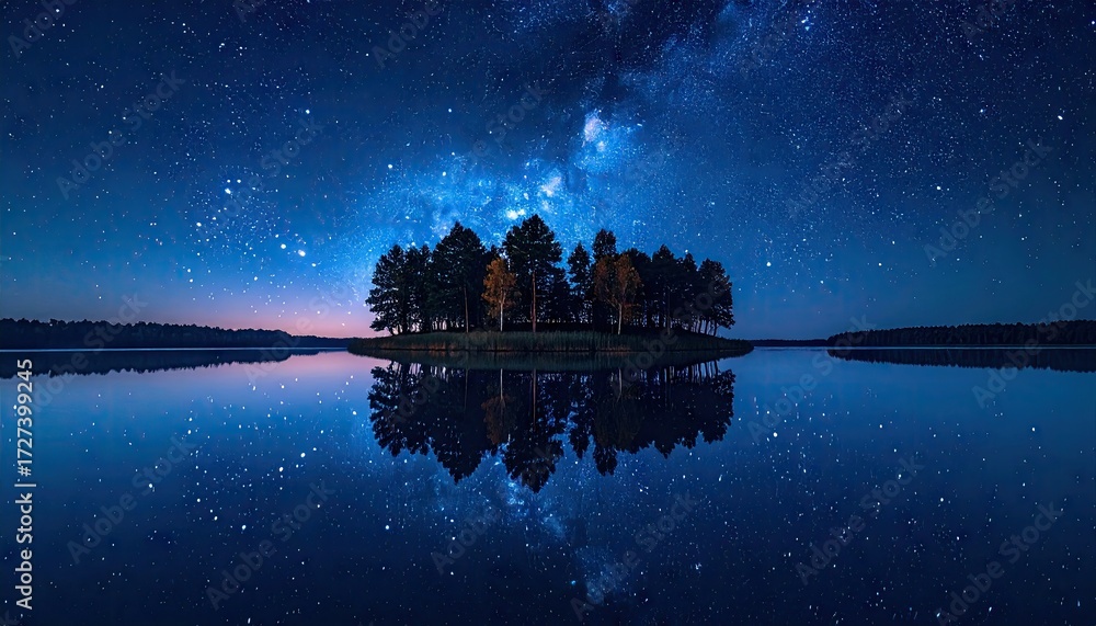 Plakat Wyspy - Serene island silhouette under a breathtaking starry night sky reflection. #1727399245