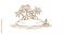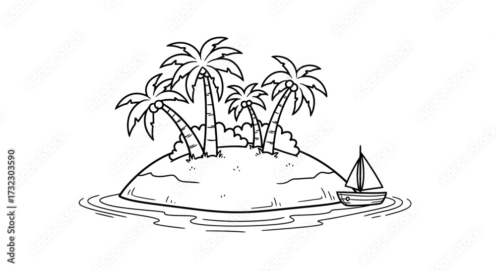 • A charming monochrome illustration depicting a deserted island with swaying palms and a sailboat