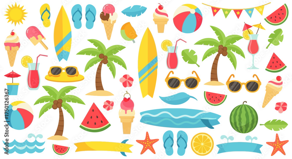 • Collection of Summer Beach Vacation Tropical Island Recreation and Travel Elements