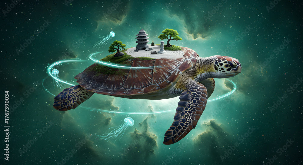 Plakat Wyspy - Turtle carrying a small island with a pagoda in space #1767390034