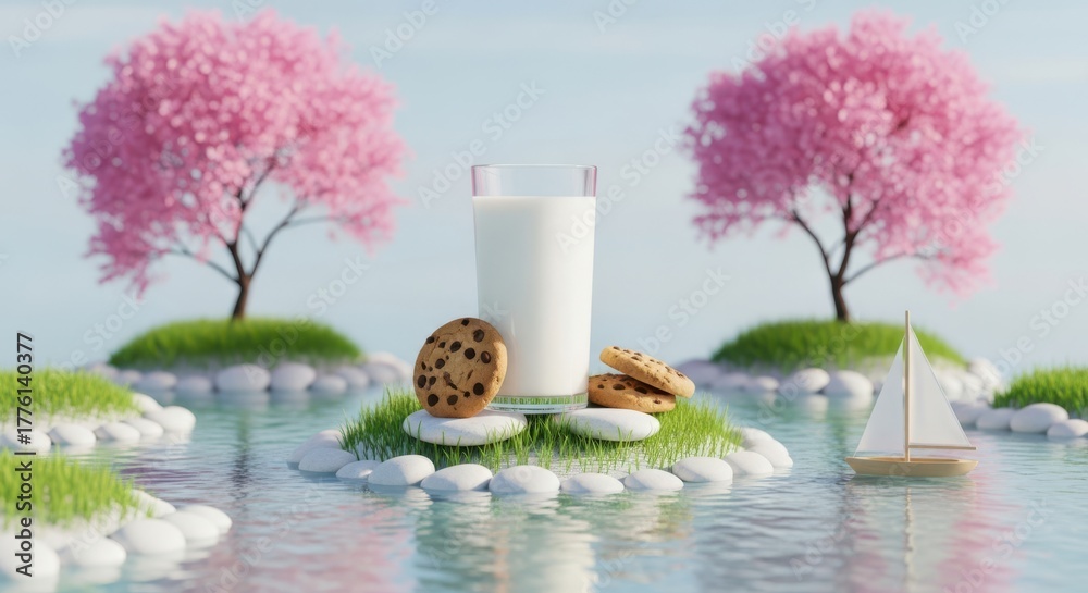 Plakat Wyspy - A glass of milk and cookies on a small island with cherry blossoms #1776140377