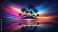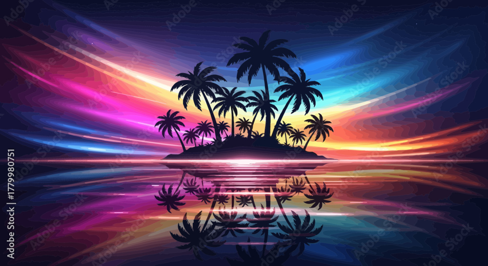 • Vibrant tropical island silhouette with dynamic colorful reflections