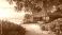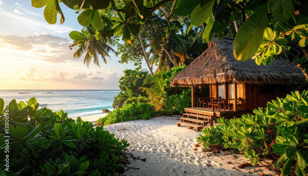 • Tropical Island Paradise Beach Hut Bungalow Overlooking Turquoise Ocean Water At Sunrise With Lush Green Foliage And White Sand Path