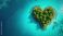 • Heart shaped island with green palm trees in clear blue ocean water. Lush tropical paradise landscape seen from above. Idyllic beach coast for peaceful vacation getaway.