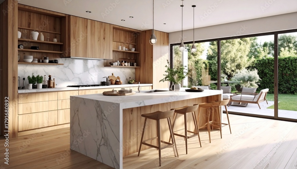Plakat Wyspy - Modern kitchen interior with wood and marble island and lush outdoor view. #1791680892