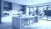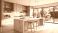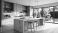 • Modern kitchen interior with wood and marble island and lush outdoor view.