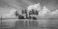 • A serene tropical island with a small sandy beach, crystal-clear turquoise waters, and lush green palm trees under a bright blue sky with fluffy white clouds.
