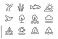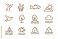 • River Delta Icon Set. River delta. Line icon set of river delta: branching river, reeds, fish, wave, mountain, sun, bird, tree, island, cloud, boat, rock. All