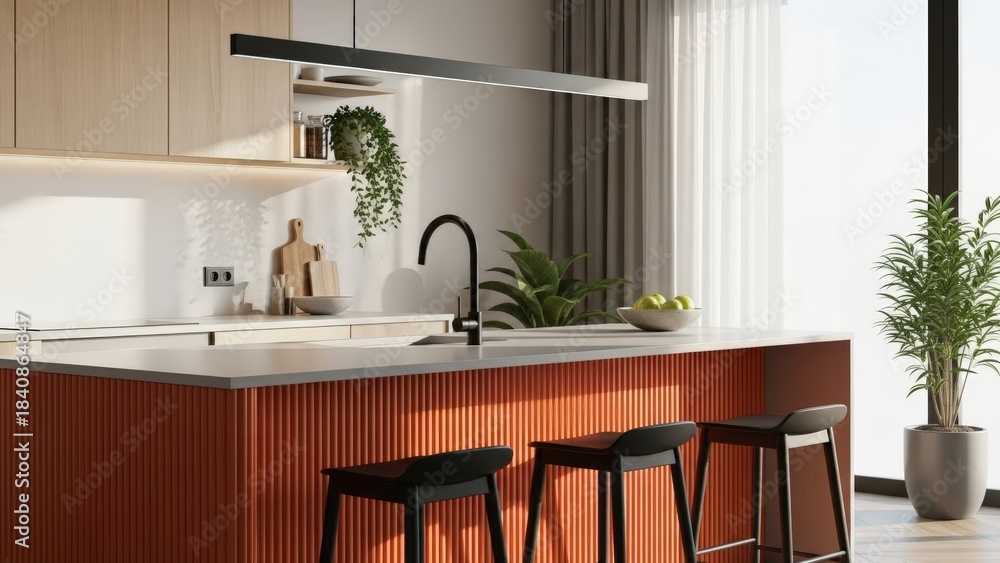 • Modern Kitchen Island with Bar Stools and Natural Light.