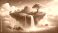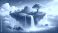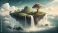 • Floating island with vibrant tree and waterfalls in cloudy sky