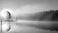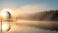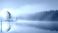 • Golden Sunrise Mist on Tranquil Lake Silhouetted Pine Island Reflected in Calm Waters.