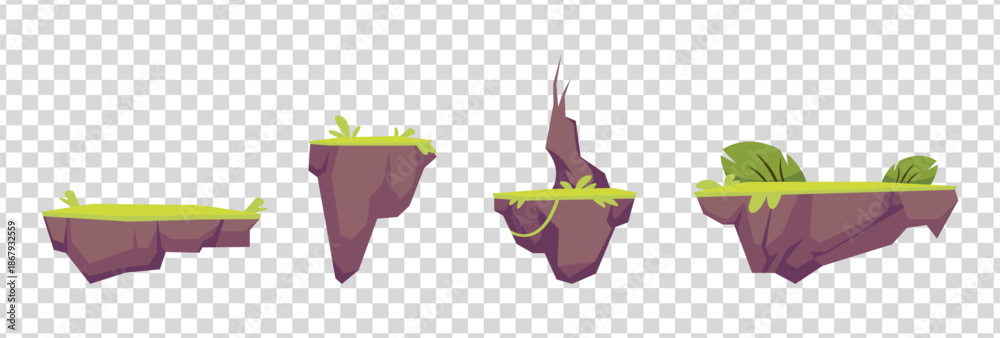 Plakat Wyspy - Floating island vector set. Tropical landscape and fantasy floating land illustrations #1867932559