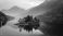 • Serene island nestled in lake with mountains fading into misty sky