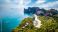 • Aerial view of the beautiful Hong island in Thailand with lush greenhills and golden beaches surrounded by emerald sea