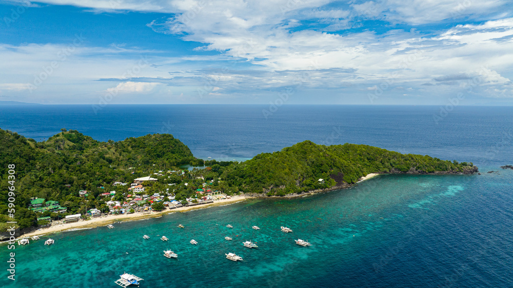 Plakat Wyspy - Tropical island with a beach. Apo Island. Popular dive site and snorkeling destination with... #590964308