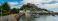 • Panoramic image of Mont Orgueil Castle in Gorey on the island of Jersey in the Channel Islands. Fishing boats and colourful buildings with sunshine and blue sky