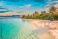 • Tranquil closeup calm sea water waves with palm trees. Beautiful sunrise sunset sunlight. Tropical island beach landscape exotic shore coast. Summer vacation, holiday amazing nature. Relax paradise