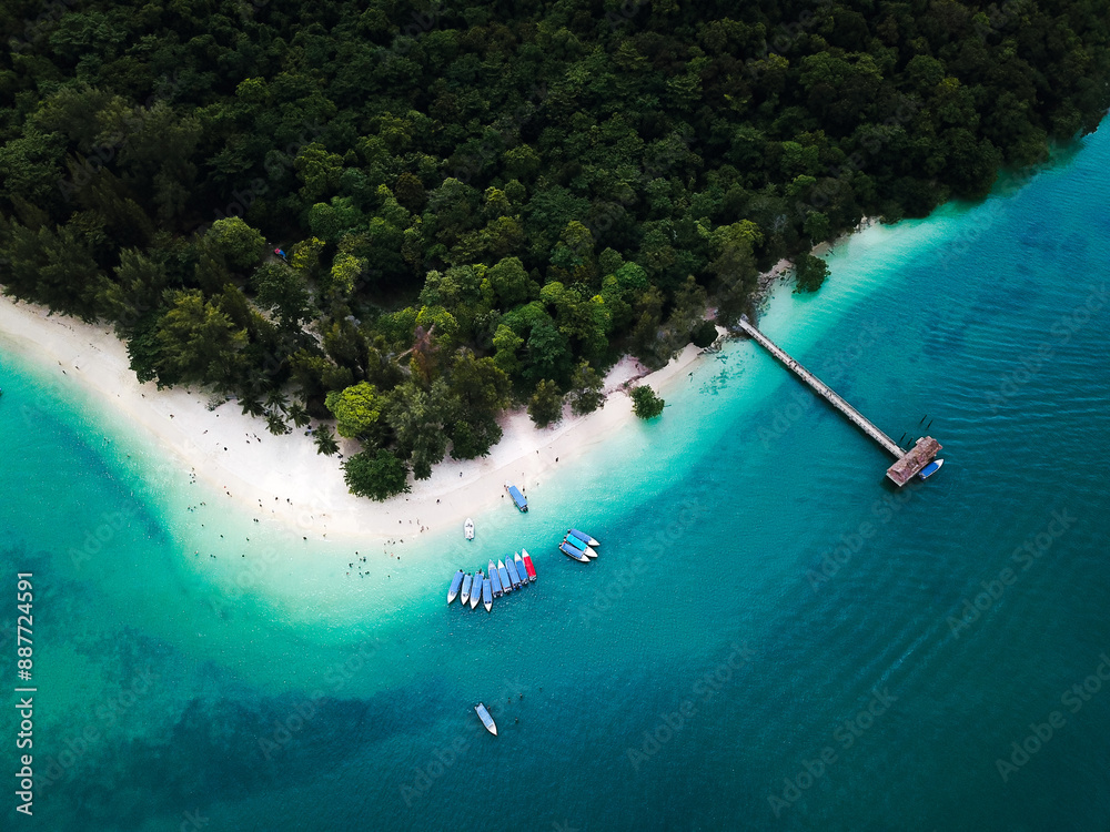 Plakat Wyspy - Aerial view of Perhentian Islands beach with boats docked near a wooden pier and lush greenery #887724591
