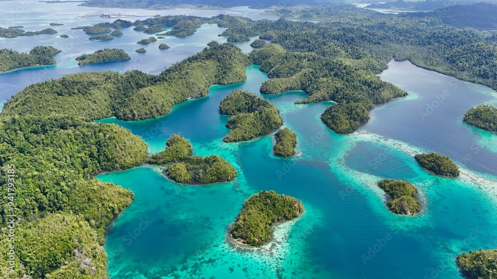Plakat Wyspy - Aerial View of the Thousand Islands in the Togean National Park, Central Sulawesi, Indonesia.... #941793185