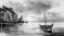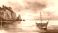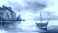 • Watercolor painting of seascape of rock formation and boat at sunset. Ocean scenery. Blue water.