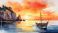 Plakat Wyspy - Watercolor painting of seascape of rock formation and boat at sunset. Ocean scenery. Blue water. #946590450