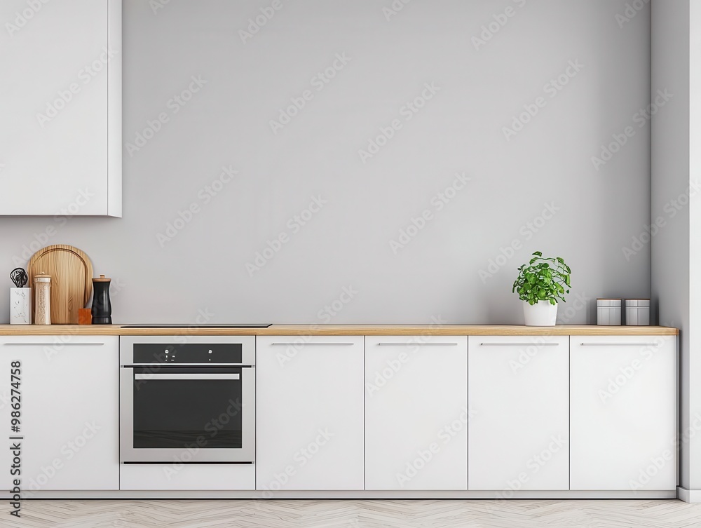 Plakat Wyspy - Simple kitchen with white cabinets and streamlined appliances, minimalistic furniture, harmonious... #986274758