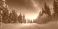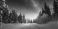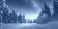 • A serene winter landscape featuring a snow-covered road and majestic trees illuminated by a starry night sky.