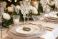 • elegant winter wedding tablescape, elegant winter wedding table with snowy decorations and stylish silver cutlery, crystal glasses, and white plates with wreath accents