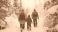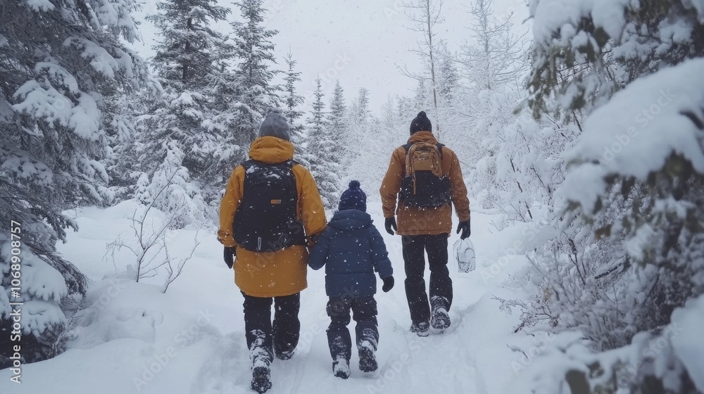 Plakat Zima - Family hiking through a snowy forest on a winter day #1068908757
