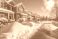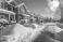 • A scenic winter neighborhood with snow-covered houses, blue skies, and a clear street creating a peaceful and picturesque atmosphere.