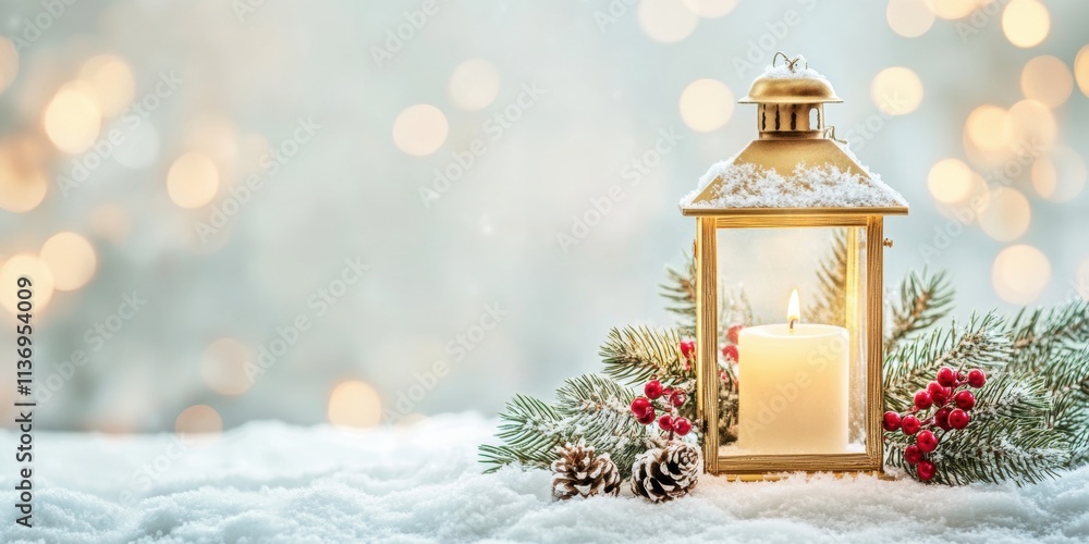 Plakat Zima - A serene winter scene featuring a lantern with a candle surrounded by pine branches and berries,... #1136954009
