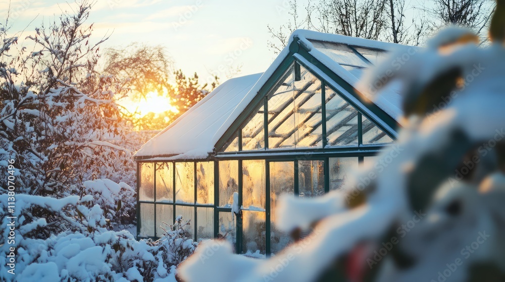 Plakat Zima - Serene winter sunset illuminating snowy greenhouse roof surrounded by tranquil nature scene #1138070496