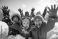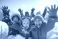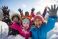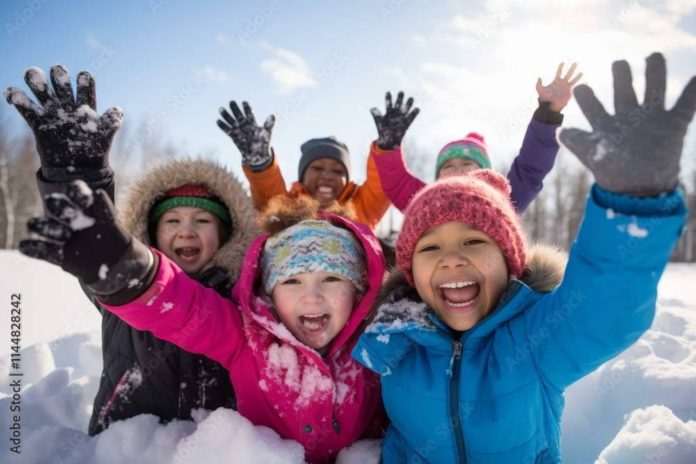 • Group of joyful kids enjoying a snowy winter day, bundled up in warm clothes, waving and smiling