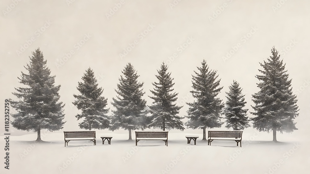 Plakat Zima - Snow-covered park benches and pine trees in winter landscape. #1182352759