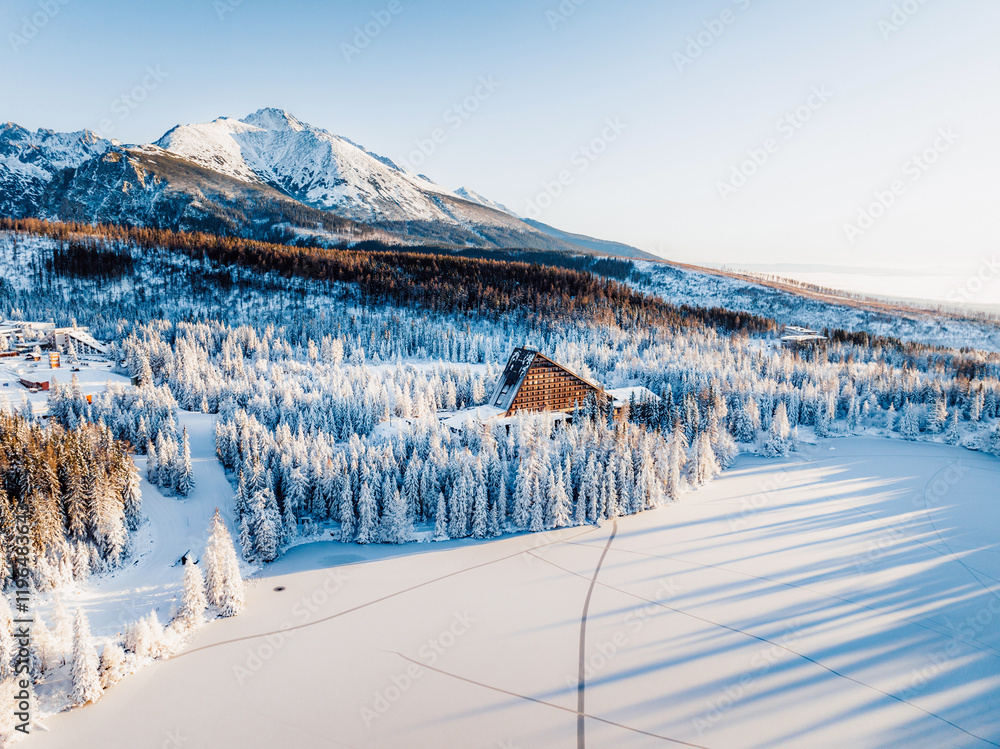 Plakat Zima - Frozen winter mountain lake Strbske pleso. Strbske lake with view of the High Tatras National... #1196483643