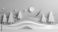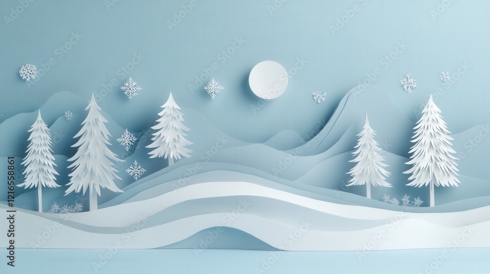 • paper cut winter landscape with white trees, snowflakes and a full moon on a light blue background