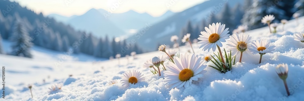 • Frozen daisies on a snowy hillside in the distance, landscape, winter