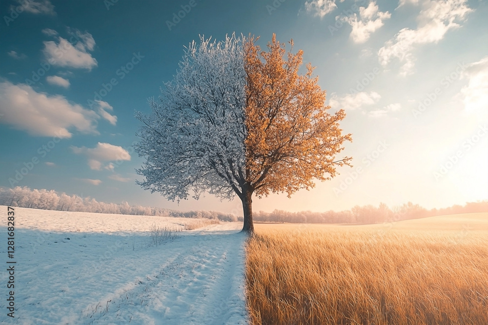 Plakat Zima - A single tree splits into winter and summer contrasting a snowy field and a golden one #1281682837
