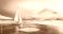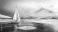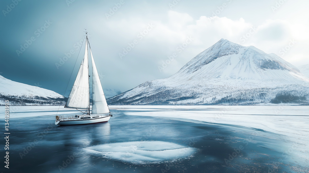 • A sailboat floating on frozen lake and overcast sky, Serene winter landscape with snow capped mountain