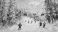 • Vibrant winter ski scene with skiers and snow-covered trees in oil painting