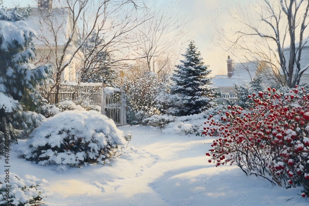 Plakat Zima - Picturesque winter wonderland scene of a snowy garden with a white fence, trees, and a beautiful... #1478620859