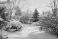 • Picturesque winter wonderland scene of a snowy garden with a white fence, trees, and a beautiful sky.