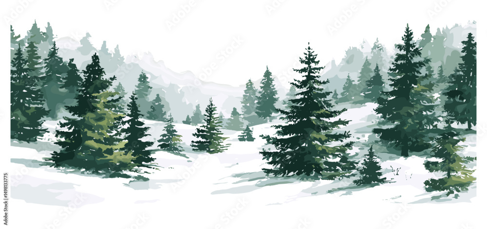 • Hand drawn christmas tree forest, winter holiday landscape, watercolor vector illustration, wide background, snowy woods, nature scenery, greeting card scene, mountain forest, png.