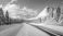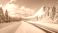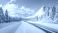 • Winter landscape featuring a snowy mountain road under a blue sky