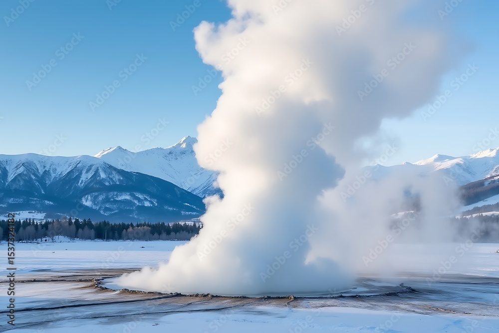 Plakat Zima - Majestic geyser erupts steam against snowy mountain range winter wonderland #1537324182