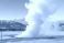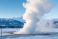 • Majestic geyser erupts steam against snowy mountain range winter wonderland